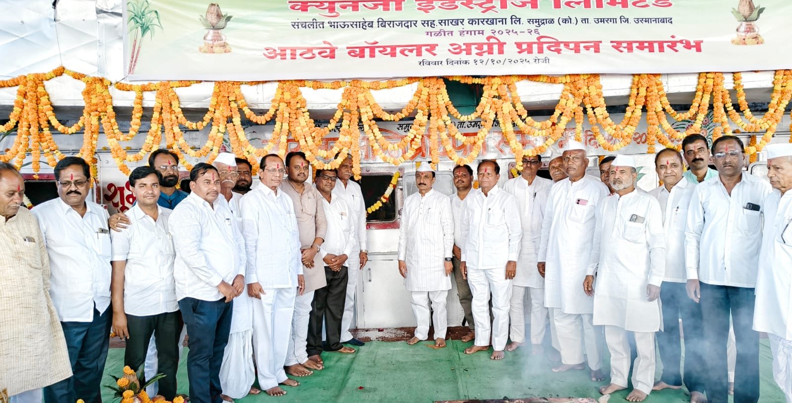 उमरगा : उमरगा तालुक्यातील समुद्राळ येथे रविवार दि . १२ रोजी भाऊसाहेब बिराजदार सहकारी साखर कारखाना संचलीत क्वीनर्जी इंडस्ट्रीज लि . चा सन २०२५ च्या आठव्या ऊस गळीत हंगामाचे बॉयलर पुजन संचालक राजेंद्र माने व सौ मिना माने यांच्या हस्ते सपत्नीक करण्यात आले तर बॉयलर अग्नीप्रदिपन कारखान्याचे चेअरमन प्रा . सुरेश बिराजदार , संचालक साहेबराव पाटील, व्यंकटराव सोनवणे, योगीराज कदम,इमाम पटेल, तुकाराम बिराजदार तर सिद्राम जाधव ,भिमा स्वामी ,मारुती पाटील, नेताजी कवठे, राम जाधव, अशोक कारभारी, महेश भगत ,सुनील साळुंखे, शमशोद्दीन जमादार,दत्ता वाडीकर,शिवाजी पवार, सचिन सरवदे , यांच्या हस्ते करण्यात आले .