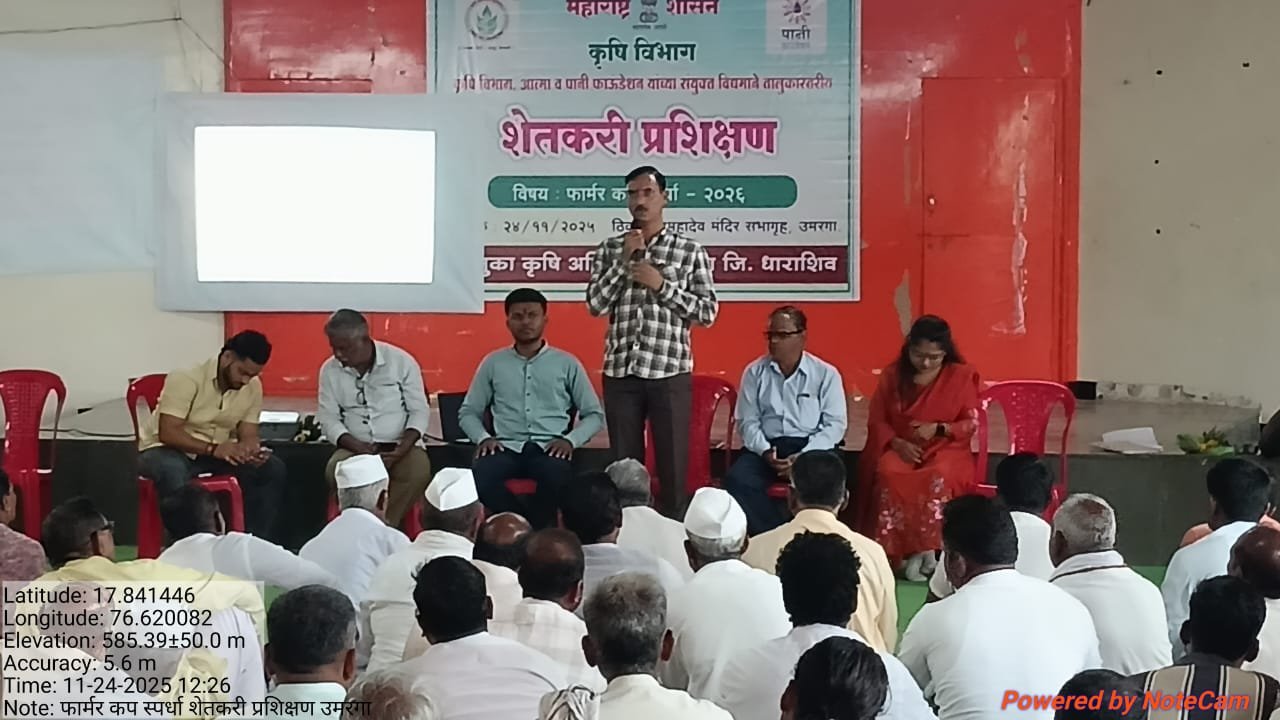 उमरगा:– शेतकरी गटांना शाश्वत, तंत्रज्ञान आणि शास्त्रशुध्द शेतीकडे वळवून त्यांचे उत्पादन वाढवणे आणि उत्पादन खर्च कमी करण्याच्या दृष्टीने प्रयत्न व्हावेत, यासाठी पाणी फाउंडेशन आणि कृषी विभाग यांच्या संयुक्त विद्यमानाने फार्मर कप या स्पर्धेचे आयोजन करण्यात आले आहे. यासाठी उमरगा तालुक्यातील शेतकऱ्यांसाठी दि. 24 नोव्हेंबर रोजी शहरातील महादेव मंदिर येथील आनंद सभागृह, येथे कृषि विभाग महाराष्ट्र शासन, आत्मा व पाणी फाऊंडेशन यांचे संयुक्त विदयामाने उमरगा तालुकास्तरीय एकदिवसीय प्रशिक्षण आयोजीत करण्यात आले.कार्यक्रमाचे प्रास्ताविक उमरगा चे तालुका कृषि अधिकारी ज्ञानोबा रितापुरे यांनी केले. उमरगा तालुक्यातील शेतकरी गटांनी या फार्मर कप स्पर्धेत सहभागी होण्याचे याप्रसंगी आवाहन केले. पाणी फाऊंडेशनतर्फे संस्थेचे वैभव सुरवसे, युवराज निंबाळकर, प्रतिक्षा आसबे यांनी शेतकरी गट संघटना, शेतकरी उत्पादक कंपनीचे महत्व व त्यांची कार्यपध्दती तसेच पाणी फाउंडेशनची वाटचाल व शेतीशाळेचे महत्व या मुदयावर सविस्तर मार्गदर्शन केले.पाणी फाउंडेशनतर्फे राबविण्यात येणा-या फार्मर कप या उपक्रमाची राज्यात व्याप्ती वाढविण्याचा निर्णय राज्य शासनाने घेतला आहे. त्यासाठी प्रत्येक जिल्ह्यात हा उपक्रम राबविण्यात येत आहे. त्यानुसार धाराशिव जिल्ह्यात देखील पाणी फाउंडेशन व कृषी विभागाच्यावतीने हा उपक्रम राबविण्यात येणार आहे. त्यासाठी फार्मर कप ही स्पर्धा 2026 पासुन घेण्यात येणार आहे.फार्मर कप स्पर्धा म्हणजे गटशेतीला प्रोत्साहन देणे. यासाठी या गटशेतीमध्ये किमान ११ सदस्य आणि किमान १५ एकर जमीन क्षेत्र असणे आवश्यक आहे. हे निकष पूर्ण करणारा गटशेती गट सहभागीहोऊ शकतो. या स्पर्धेचा हेतू गट शेतीचे उत्पादन खर्च कमी करणे. मजुरीची बचत करणे, स्वस्तात खते व बियाणे,किटकनाशके यासारख्या कृषि निवीष्ठांची तसेच कृषि यंत्रे व औजारे उपलब्ध करण्याचा हेतू आहे.शेतकरी प्रशीक्षणादरम्यान. महेंद्रकर यांनी रब्बी हंगाम व्यवस्थापन मध्ये पेरणीपुर्वी जमनिधी पुर्वमशागत, बिज प्रक्रीया, बियाणे उगवण क्षमता तपासणी यांची माहिती सागीतली व अतुल गायकवाड, रमेश पाटील यांनी सदरील प्रात्यक्षीक करुन दाखवीले.सचिन पवार यांनी कृषि क्षेत्रातील अधुनीक तंत्रज्ञानाचा वापरातुन विवीध योजनांची माहिती व तंत्रज्ञानाविषयी सखोल माहिती जसे की, पिक सल्ला, मृदा अरोग्य पचौका, हवामानास अनुकुल शेती पध्दती, किड व रोग नियंत्रण बाजारभाव यासाठी महाविस्तार AI या अॅपबाबत सविस्तर माहिती देण्यात आली.प्रशिक्षणाच्यावेळी तालुका कृषी अधिकारी डी बी रितापुरे, तसेच मंडळ कृषी अधिकारी, उपकृषी अधिकारी आणि सहाय्यक कृषी अधिकारी यांच्यासह, गटा